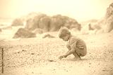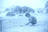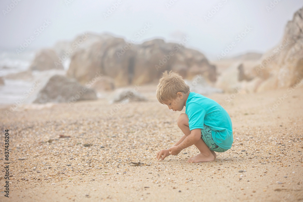 Beautiful blond child, boy, gathering shells on the beach in Portugal on a cloudy foggy day