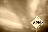 Yellow transportation sign with word AGM (Abbreviation of annual general meeting) on violet color sky background