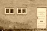Outdoor exterior street view in front of rough yellow painted wall, wooden white door and windows.