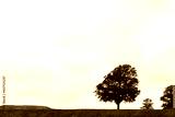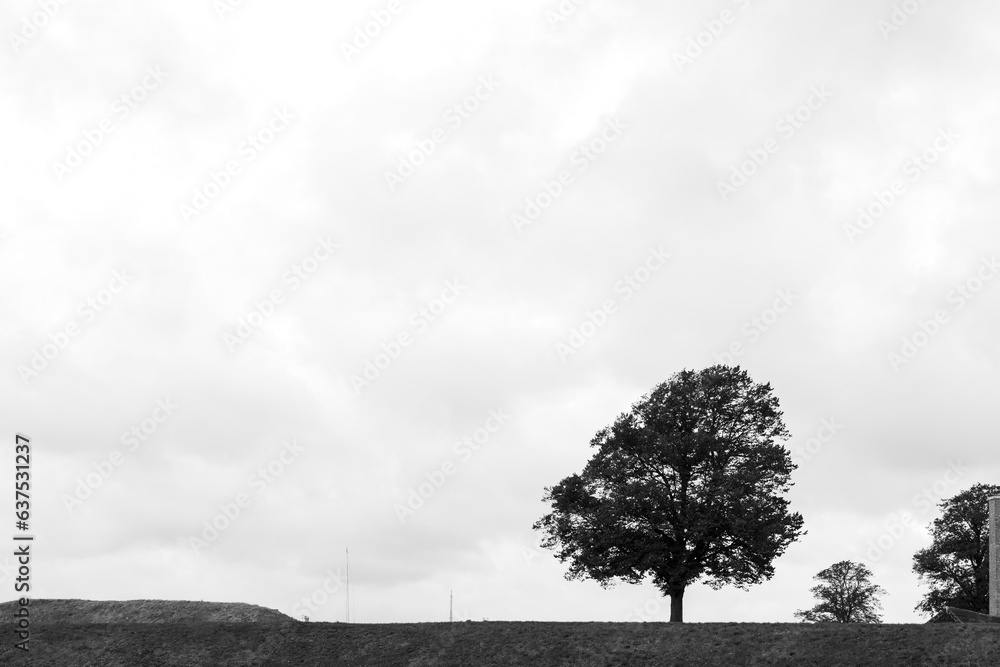 Black and white tone, silhouette and low angle view at one tree on the hill against cloudy sky.