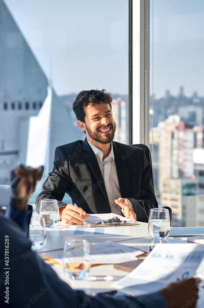 Happy professional young latin business man company executive working with team colleagues people discussing financial project in office at group meeting table in corporate board room. Vertical