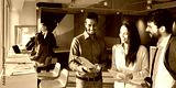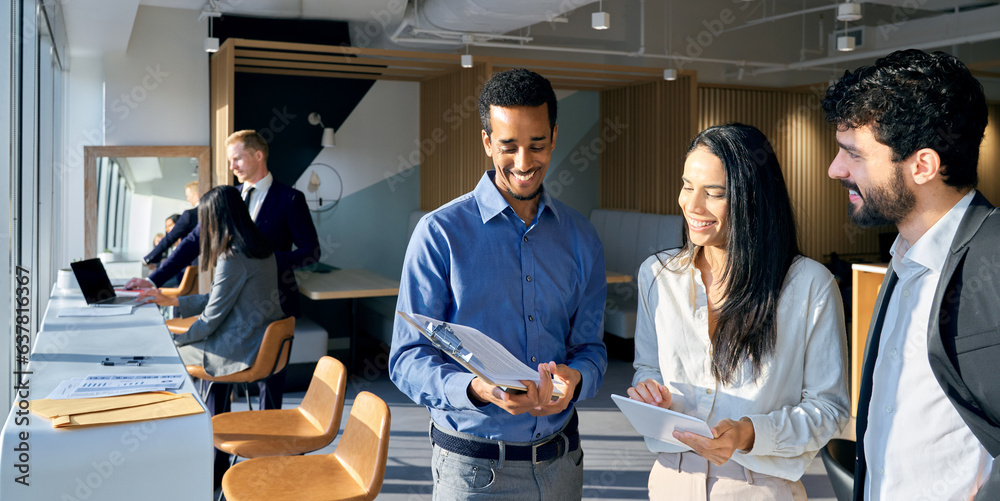 Young happy diverse professional international team business people workers standing in corporate office coworking space and talking, having teamwork conversation together at work meeting.