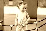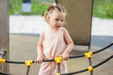 Little toddler girl having fun at playground. Educational playground equipment. Sensory experience