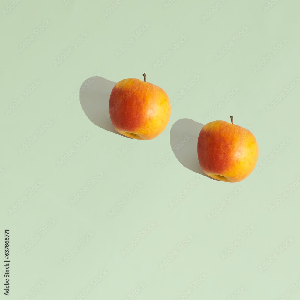 Two fresh apples on a pastel mint green background. Copy space. Minimal concept. Organic nutrition. Natural pattern.