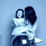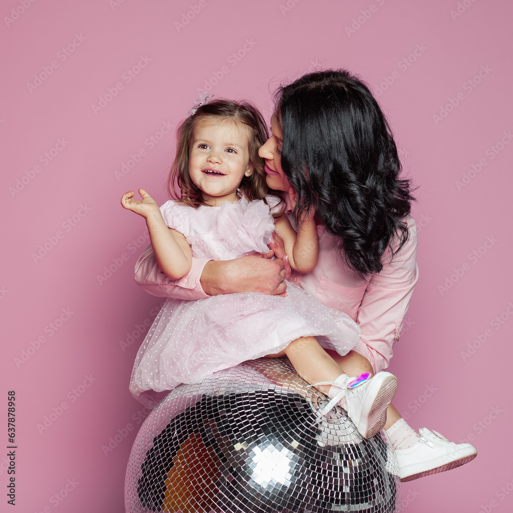 Mother and daughter portrait. Mom and child baby girl hugging on pink wall background