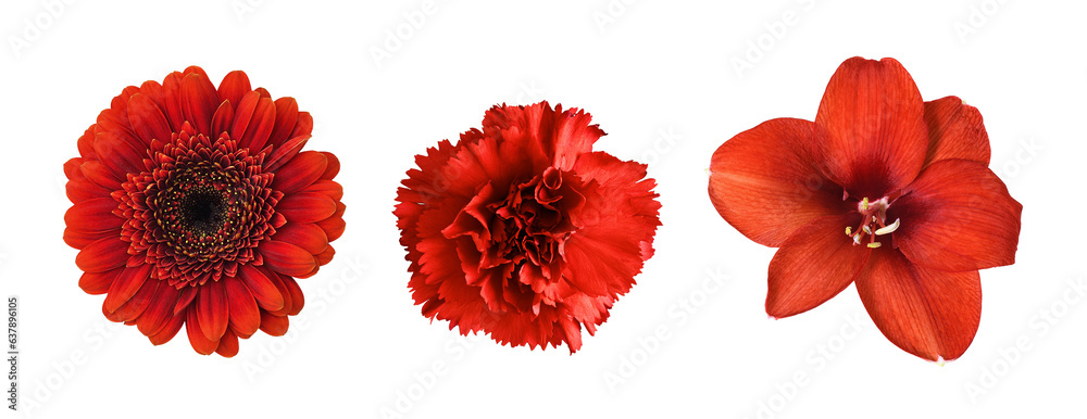 Set of different red flowers (amaryllis, gerbera, carnation) isolated on white or transparent background. Top view.