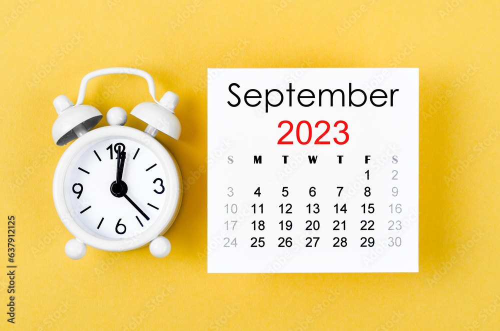The September 2023 Monthly calendar for 2023 year with alarm clock on yellow background.
