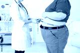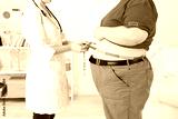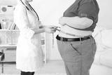 Doctor examining patient obesity on light background