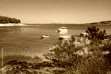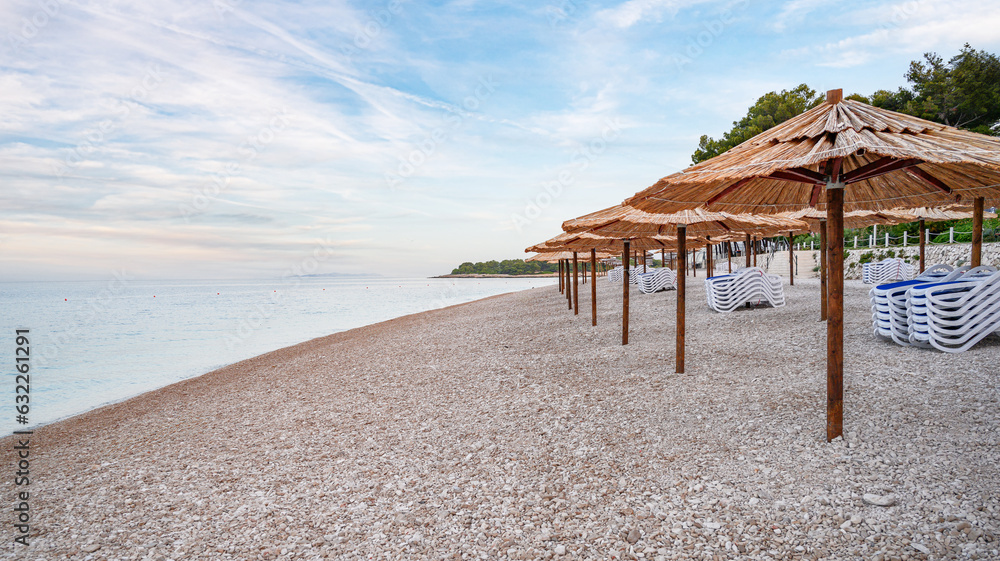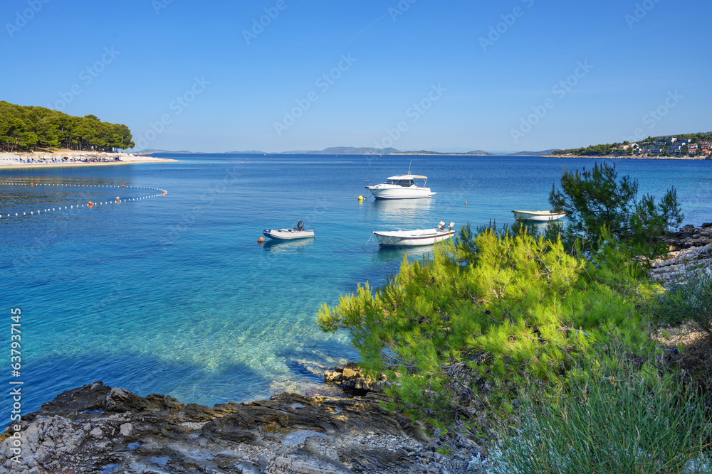 Beach and boats on the Adriatic coast. Primosten, Croatia.