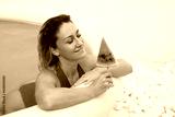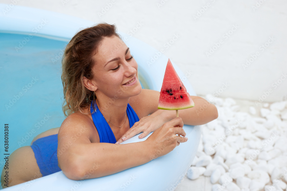 a girl in a bathing suit swims in the pool in a hot summer, a girl with a watermelon