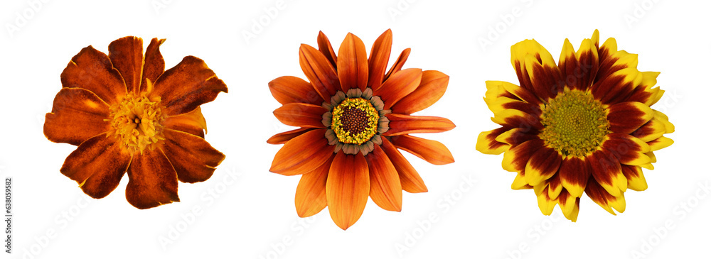 Set of different brown flowers (gazania; marigold, chrysanthemum) isolated on white or transparent background. Top view.