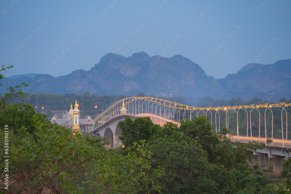 Thai Laos bridge with Mekong River with green mountain hill. Nature landscape background in Nong Khai, Thailand.