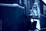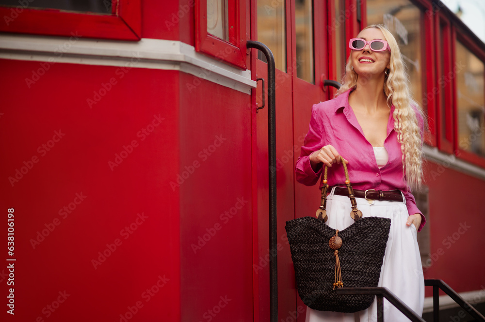 Fashionable happy smiling blonde woman wearing trendy pink sunglasses, linen shirt, white bermuda shorts, holding black straw wicker bag, posing in street of city. Copy, empty space for text