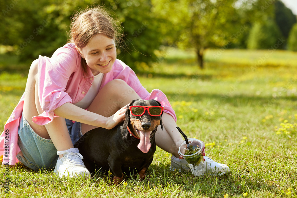 dachshund dog in sunglasses on a hot day drinks a refreshing cocktail, hot summer concept