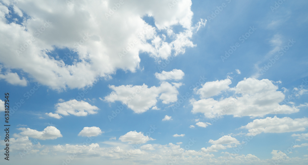 Clear blue sky with white fluffy clouds at noon. Day time. Abstract nature landscape background.