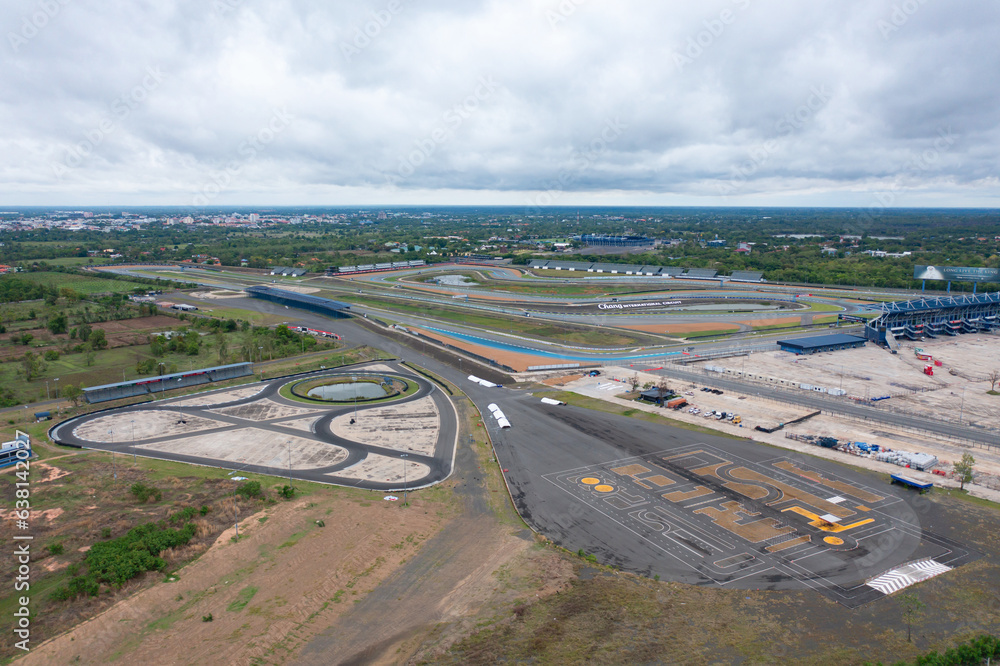 Aerial top view of a car driving test center with street road. Course field, practice vehicle school. Map site design.