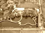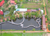 Aerial top view of fresh paddy rice with lake and houses in cafe, green agricultural fields in countryside or rural area in Thailand. Nature landscape background.