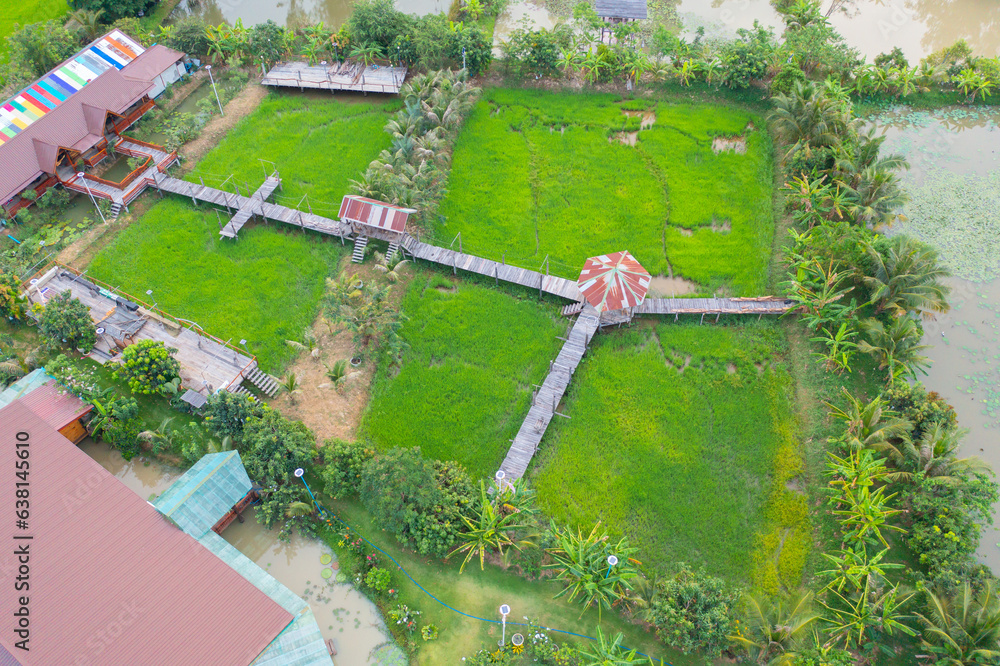 Aerial top view of fresh paddy rice with lake and houses in cafe, green agricultural fields in countryside or rural area in Thailand. Nature landscape background.