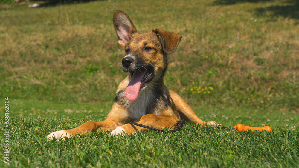 CLOSE UP: Young mixed breed dog on a short rest during playtime in sunny garden