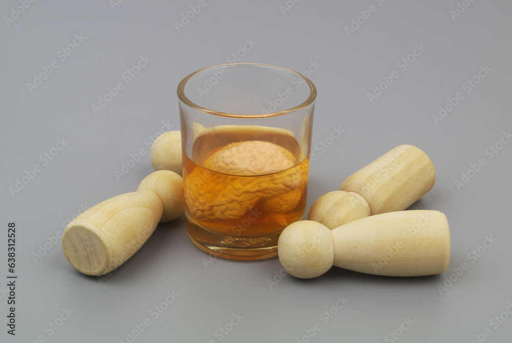 Human brain model drowned in alcohol and people figures. Alcoholism concept.