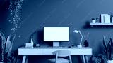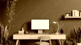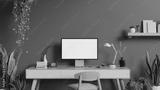 Modern green home office workspace with a computer on a desk, indoor tropical plants, a chair