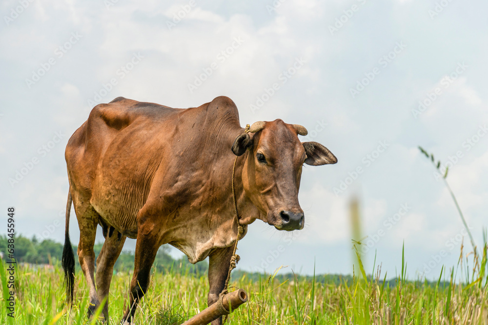 Indian brown color cow eating grass in the rice field