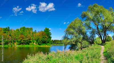 river with trees on its banks and a blue sky with clouds