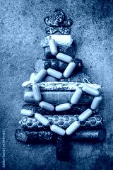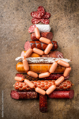 Christmas tree from different types of sausages, salami and smoked meat with basil and spices on stone background. Top view.