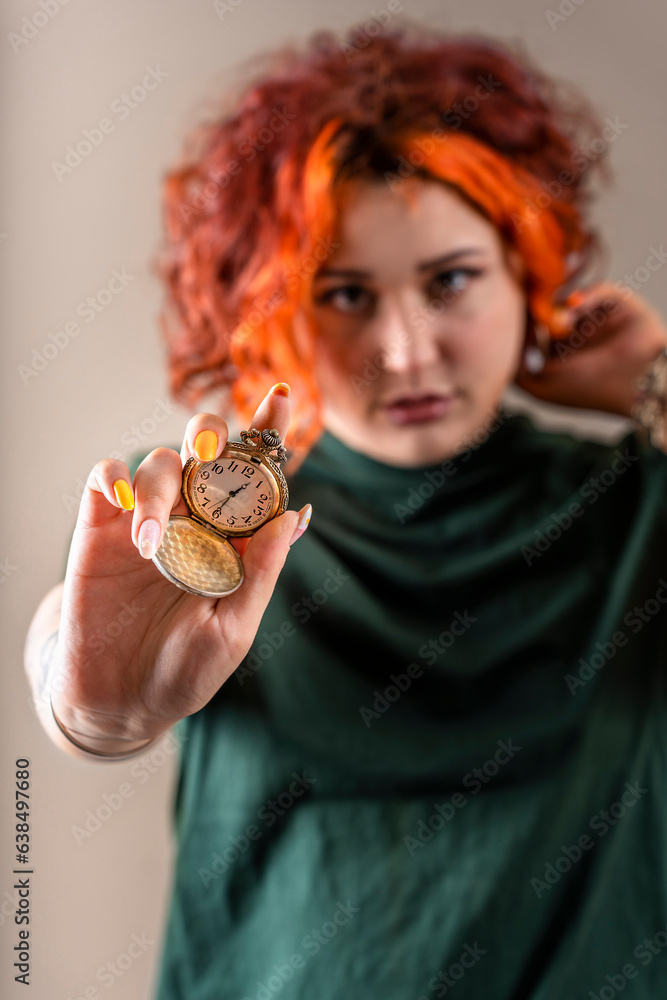 Modern non-binary redhead girl shows you the time on her pocket watch