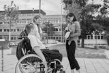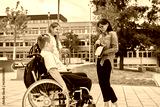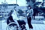 Female teacher and children, boy in wheelchair and girl talking outdoor