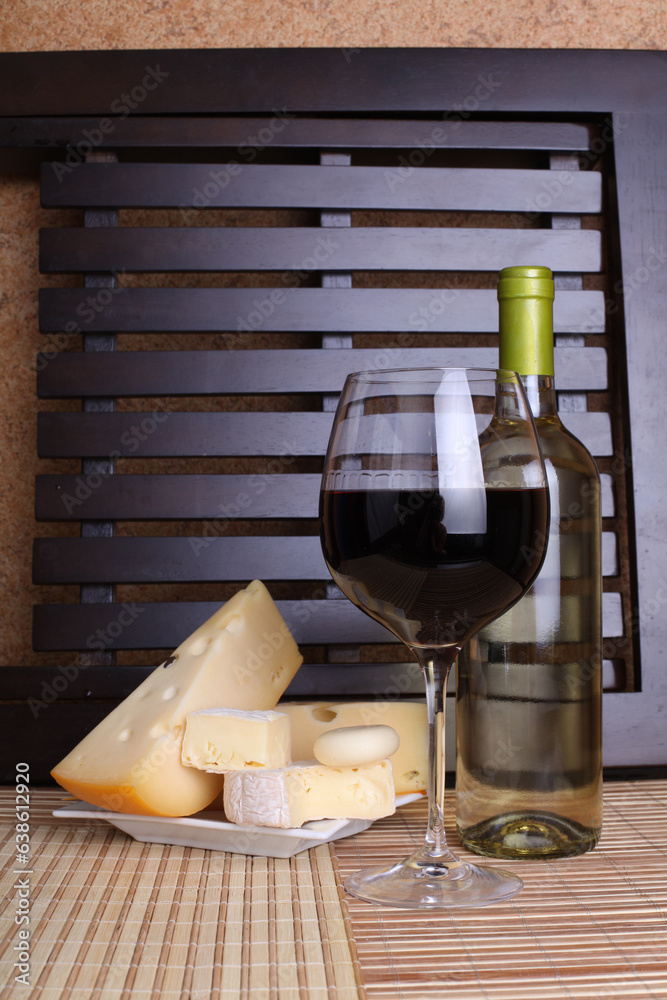 Cheese, wineglass, bottle of White dry wine. Rustic still life.