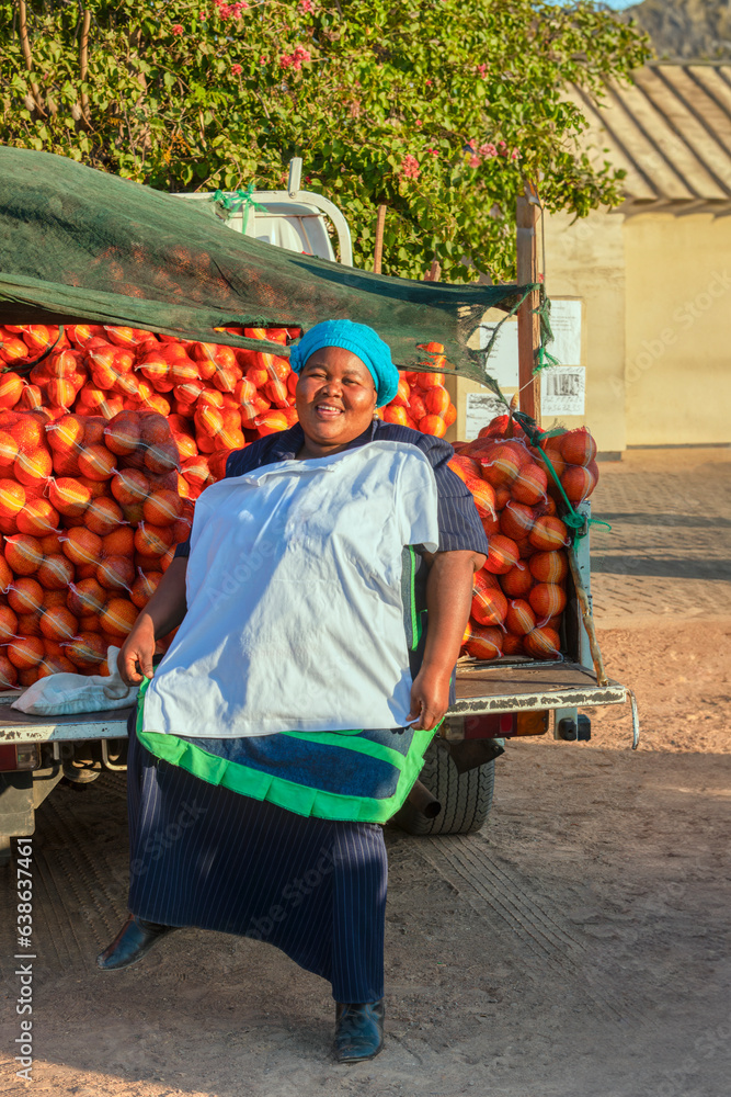 African woman street vendor, selling oranges on the side of the road, entrepreneurial skills