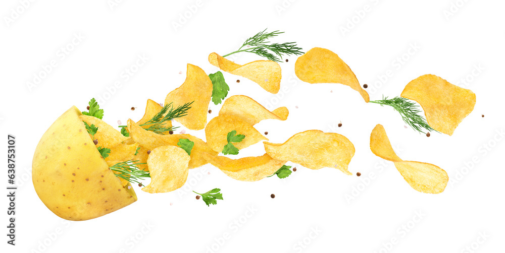 Chips with herbs and spices fly out of potatoes on a white isolated background