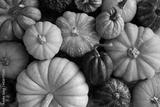 Lots of pumpkins of different sizes and colors. Autumn harvest. Top view. Selective focus.