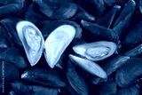 Fresh green mussels background, Perna Viridis, few mussels open.