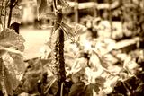 Organic cucumbers cultivation. Closeup of fresh green vegetables ripening in glasshouse