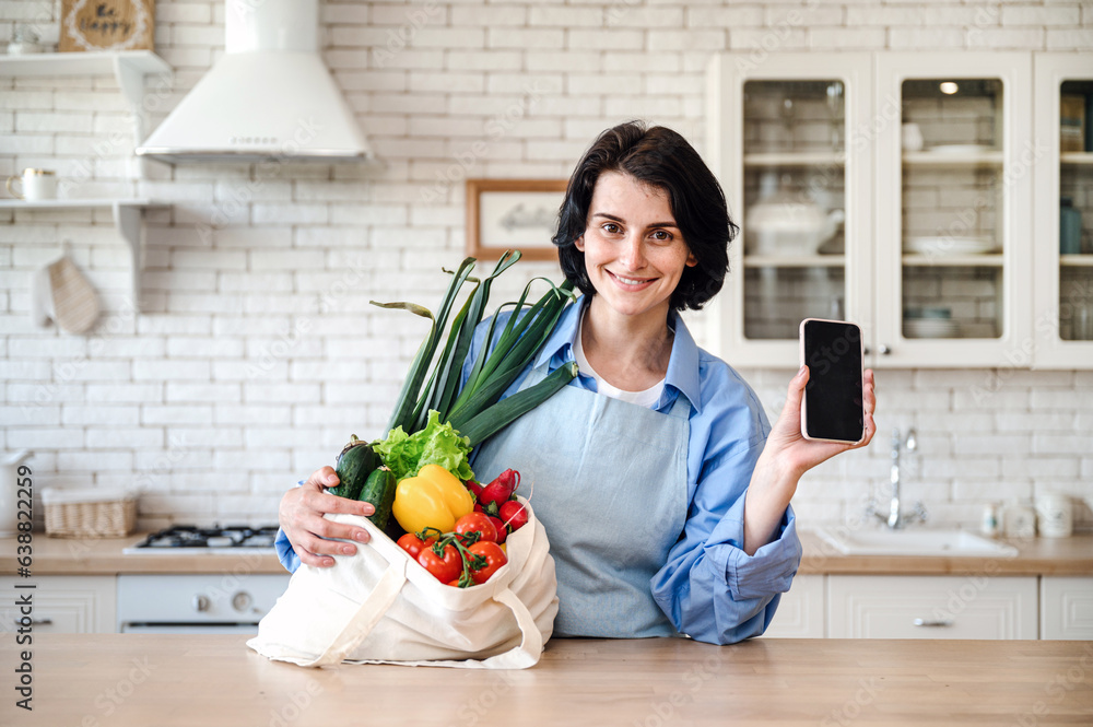 Woman hold bag full fresh vegetables and smartphone for online purchase