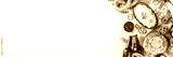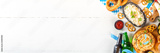 Oktoberfest munich traditional festival menu foods - bavarian sausages, pretzels, potato, sauerkraut, beer bottle and mug, Background flyer for Oktoberfest invitation on old wooden table