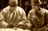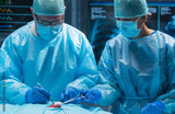 Team of medical doctors performs surgical operation in modern operating room using high-tech technology. Surgeons are working to save the patient in the hospital. Medicine, health and science.