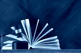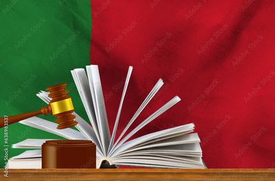 Judicial gavel on the background of an open book and the flag of Portugal.