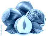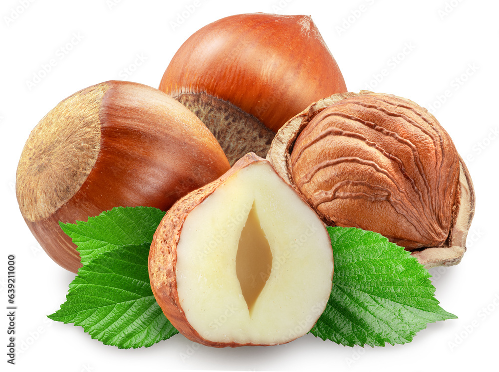 Hazelnuts, hazelnut kernel and green leaves on white background. Clipping path.