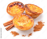 Pastel de nata tarts and cinnamon sticks isolated on white background.