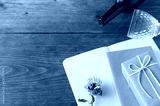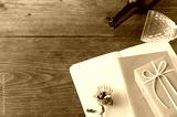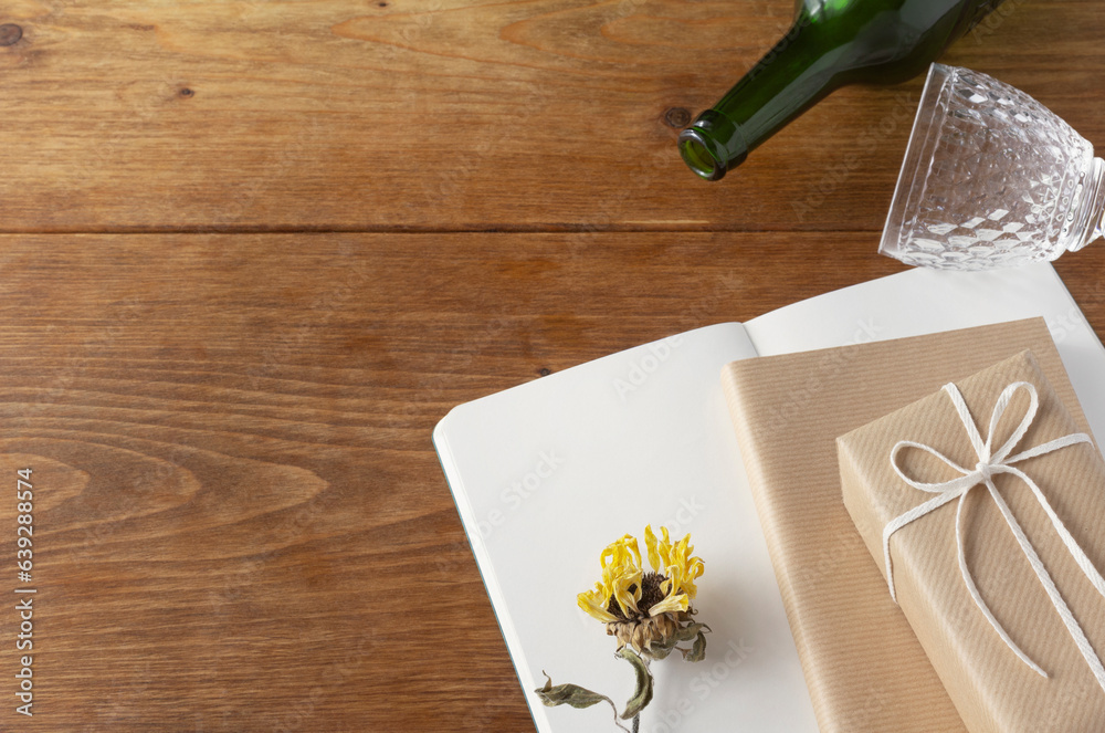 Dried sunflowers, glasses and bottles with spread notebooks and presents and dried sunflower on a wooden desk