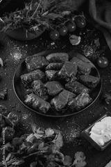 Delicious dolma on a dark background stuffed grape leaves rice. Traditional Caucasian, Turkish and Greek cuisine