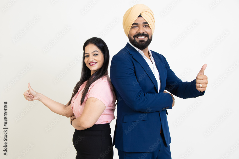 Young successful indian sikh business man and woman wearing formal dress do thumbs up isolated over white background.