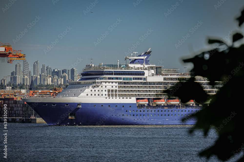 Luxury cruiseship cruise ship liner Summit arrival sail into port of Vancouver, BC Canada from Alaska Last Frontier adventure cruising during sunrise with beautiful scenic view