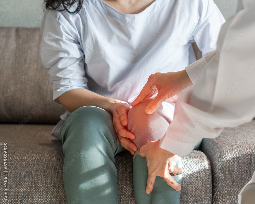 Knee and joint pain, osteoarthritis arthritis, tendon injury, sprained or strained ligaments, cartilage tears, tendonitis chronic stress in knee muscle swelling problems in aging woman patient