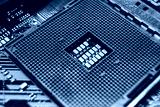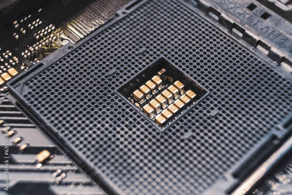 AM4 CPU Socket on motherboard of desktop PC. Computer hardware chipset components close-up. Tech industry electronics background