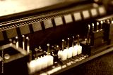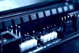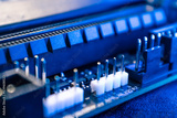 Socket pins on motherboard close-up of modern powerful desktop PC. Computer hardware chipset components background with blue light