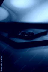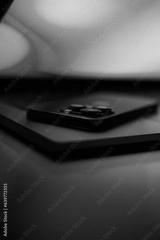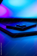 Laptop with smartphone. Neon dark light.